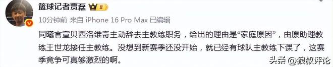 媒体人付政浩发文点评:“同曦官宣贝西洛维奇下课,理由当然是主帅最常见的辞职理由之一“因家庭原因”(另一个当然是“因身体原因”),尽量给双方留足体面。