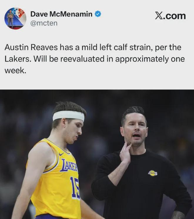近日湖人官方宣布,里夫斯遭遇左小腿轻微拉伤,一周后接受复查。